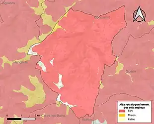 Le retrait-gonflement des sols argileux est susceptible d'engendrer des dommages importants aux bâtiments en cas d’alternance de périodes de sécheresse et de pluie[19]. 96,5 % de la superficie communale est en aléa moyen ou fort (91,8 % au niveau départemental et 48,5 % au niveau national)[Carte 2]. Depuis le , en application de la loi ELAN, différentes contraintes s'imposent aux vendeurs, maîtres d'ouvrages ou constructeurs de biens situés dans une zone classée en aléa moyen ou fort[Note 2],[20].