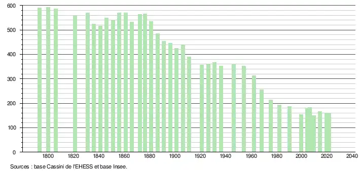 L'évolution du nombre d'habitants est connue à travers les recensements de la population effectués dans la commune depuis 1793. Pour les communes de moins de 10 000 habitants, une enquête de recensement portant sur toute la population est réalisée tous les cinq ans, les populations légales des années intermédiaires étant quant à elles estimées par interpolation ou extrapolation[26]. Pour la commune, le premier recensement exhaustif entrant dans le cadre du nouveau dispositif a été réalisé en 2004[27].