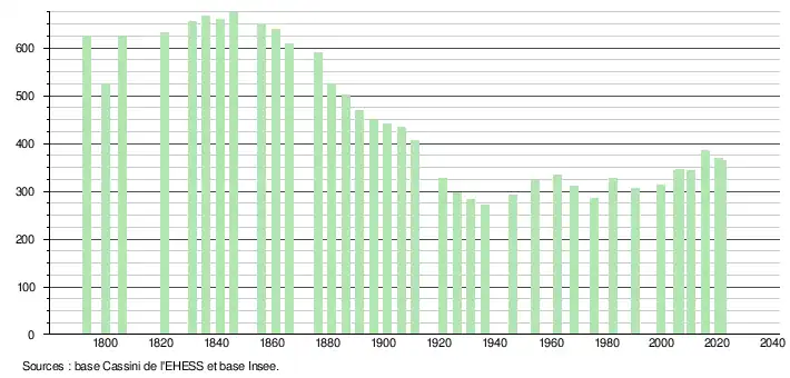 L'évolution du nombre d'habitants est connue à travers les recensements de la population effectués dans la commune depuis 1793. Pour les communes de moins de 10 000 habitants, une enquête de recensement portant sur toute la population est réalisée tous les cinq ans, les populations légales des années intermédiaires étant quant à elles estimées par interpolation ou extrapolation[20]. Pour la commune, le premier recensement exhaustif entrant dans le cadre du nouveau dispositif a été réalisé en 2005[21].