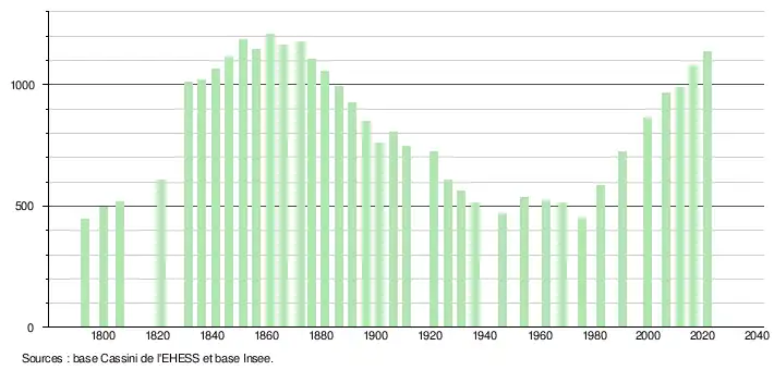 L'évolution du nombre d'habitants est connue à travers les recensements de la population effectués dans la commune depuis 1793. Pour les communes de moins de 10 000 habitants, une enquête de recensement portant sur toute la population est réalisée tous les cinq ans, les populations légales des années intermédiaires étant quant à elles estimées par interpolation ou extrapolation[20]. Pour la commune, le premier recensement exhaustif entrant dans le cadre du nouveau dispositif a été réalisé en 2006[21].