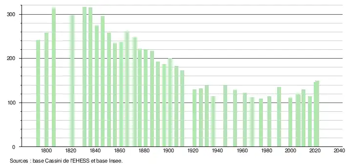 L'évolution du nombre d'habitants est connue à travers les recensements de la population effectués dans la commune depuis 1793. Pour les communes de moins de 10 000 habitants, une enquête de recensement portant sur toute la population est réalisée tous les cinq ans, les populations légales des années intermédiaires étant quant à elles estimées par interpolation ou extrapolation[21]. Pour la commune, le premier recensement exhaustif entrant dans le cadre du nouveau dispositif a été réalisé en 2005[22].