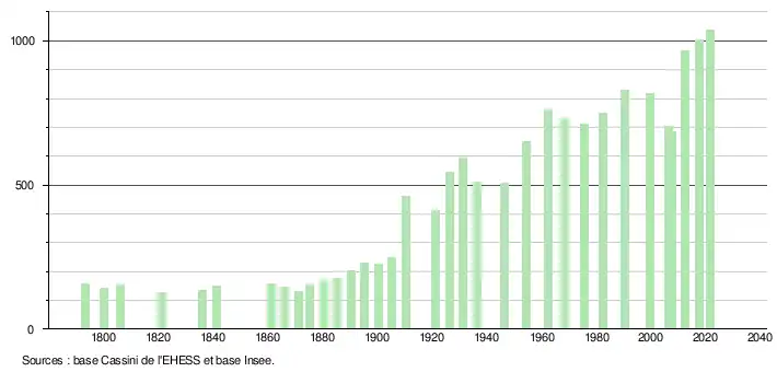 L'évolution du nombre d'habitants est connue à travers les recensements de la population effectués dans la commune depuis 1793. Pour les communes de moins de 10 000 habitants, une enquête de recensement portant sur toute la population est réalisée tous les cinq ans, les populations légales des années intermédiaires étant quant à elles estimées par interpolation ou extrapolation[20]. Pour la commune, le premier recensement exhaustif entrant dans le cadre du nouveau dispositif a été réalisé en 2007[21].