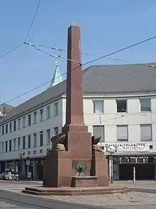 - (de) Cet article est partiellement ou en totalité issu de l’article de Wikipédia en allemand intitulé « Rondellplatz (Karlsruhe) » (voir la liste des auteurs).