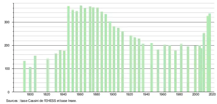 | L'évolution du nombre d'habitants est connue à travers les recensements de la population effectués dans la commune depuis 1793. Pour les communes de moins de 10 000 habitants, une enquête de recensement portant sur toute la population est réalisée tous les cinq ans, les populations légales des années intermédiaires étant quant à elles estimées par interpolation ou extrapolation[4]. Pour la commune, le premier recensement exhaustif entrant dans le cadre du nouveau dispositif a été réalisé en 2004[5]. En 2016, la commune comptait 336 habitants[Note 1], en augmentation de 20,86 % par rapport à 2010 (Tarn : +1,82 %, France hors Mayotte : +1,84 %). |
