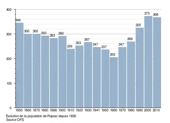 La population de Ropraz est de 346 personnes en 1850 et de 300 personnes en 1860. Elle baisse progressivement jusqu'à 205 habitants en 1960 avant de remonter à 373 personnes en 2000. Le graphique suivant résume l'évolution de la population de Ropraz entre 1850 et 2010[9] :