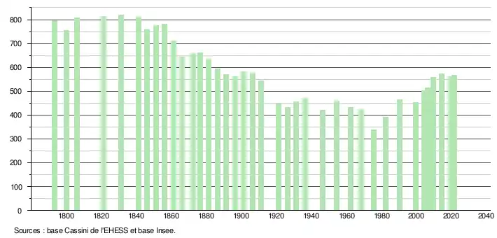 | L'évolution du nombre d'habitants est connue à travers les recensements de la population effectués dans la commune depuis 1793. Pour les communes de moins de 10 000 habitants, une enquête de recensement portant sur toute la population est réalisée tous les cinq ans, les populations légales des années intermédiaires étant quant à elles estimées par interpolation ou extrapolation[32]. Pour la commune, le premier recensement exhaustif entrant dans le cadre du nouveau dispositif a été réalisé en 2004[33]. En 2021, la commune comptait 568 habitants[Note 4], en diminution de 1,39 % par rapport à 2015 (Gers : +0,79 %, France hors Mayotte : +1,84 %). |