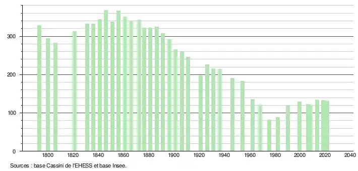 | L'évolution du nombre d'habitants est connue à travers les recensements de la population effectués dans la commune depuis 1793. Pour les communes de moins de 10 000 habitants, une enquête de recensement portant sur toute la population est réalisée tous les cinq ans, les populations légales des années intermédiaires étant quant à elles estimées par interpolation ou extrapolation[27]. Pour la commune, le premier recensement exhaustif entrant dans le cadre du nouveau dispositif a été réalisé en 2008[28]. En 2021, la commune comptait 132 habitants[Note 4], en diminution de 5,04 % par rapport à 2015 (Tarn : +1,82 %, France hors Mayotte : +1,84 %). |