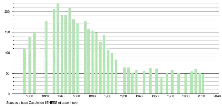 L'évolution du nombre d'habitants est connue à travers les recensements de la population effectués dans la commune depuis 1793. Pour les communes de moins de 10 000 habitants, une enquête de recensement portant sur toute la population est réalisée tous les cinq ans, les populations légales des années intermédiaires étant quant à elles estimées par interpolation ou extrapolation[15]. Pour la commune, le premier recensement exhaustif entrant dans le cadre du nouveau dispositif a été réalisé en 2007[16].