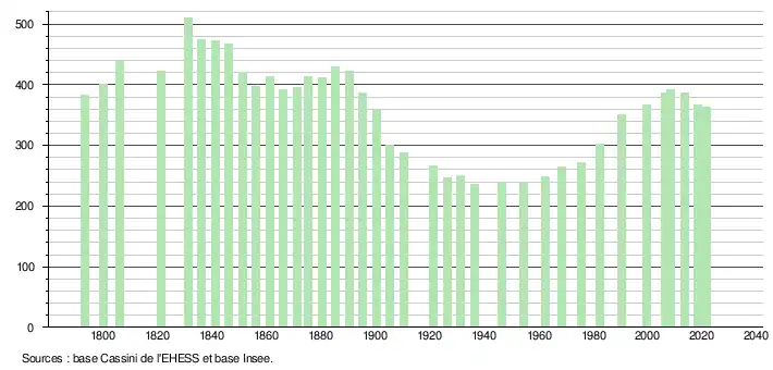 L'évolution du nombre d'habitants est connue à travers les recensements de la population effectués dans la commune depuis 1793. Pour les communes de moins de 10 000 habitants, une enquête de recensement portant sur toute la population est réalisée tous les cinq ans, les populations légales des années intermédiaires étant quant à elles estimées par interpolation ou extrapolation[20]. Pour la commune, le premier recensement exhaustif entrant dans le cadre du nouveau dispositif a été réalisé en 2008[21].