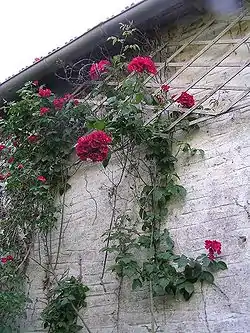- 'American pillar' grimpant très vigoureux aux bouquets de fleurs rouges simples de mai à juillet, hybride obtenu par Van Fleet en 1902 (Rosa wichuraiana × Rosa setigera) : hybride remontant à fleurs rouges