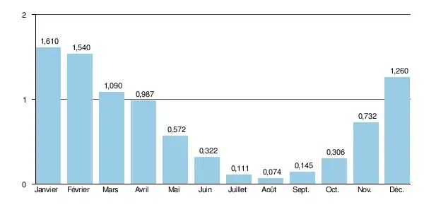 Quant aux crues, les QIX 2 et QIX 5 valent respectivement 19 et 26 m3/s. Le QIX 10 est de 30 m3/s, le QIX 20 de 34 m3, tandis que le QIX 50 se monte à 39 m3/s.