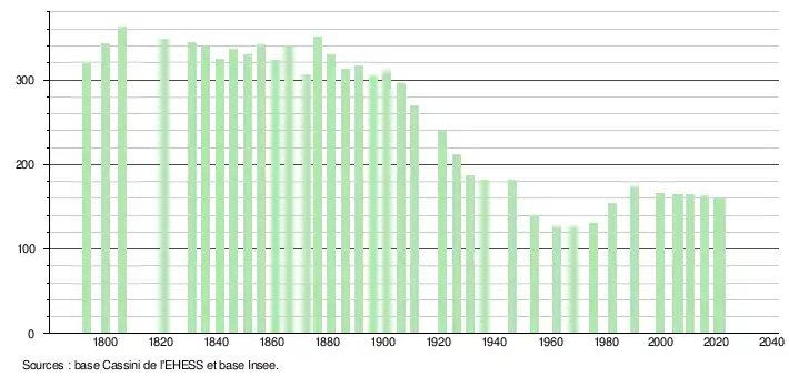 L'évolution du nombre d'habitants est connue à travers les recensements de la population effectués dans la commune depuis 1793. Pour les communes de moins de 10 000 habitants, une enquête de recensement portant sur toute la population est réalisée tous les cinq ans, les populations légales des années intermédiaires étant quant à elles estimées par interpolation ou extrapolation[20]. Pour la commune, le premier recensement exhaustif entrant dans le cadre du nouveau dispositif a été réalisé en 2005[21].