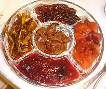 Les Juifs devant manifester leur confiance en la mansuétude divine par la joie, les repas de fête sont dignes de l'occasion. La table comporte des aliments symbolisant, parfois par des jeux de mots, l'année que l'on espère heureuse et les aliments aigres ou âpres sont évités. Cette coutume, déjà mentionnée dans le Talmud, a connu diverses variantes et été fortement développée par les kabbalistes de Safed en un séder de Roch Hachana (en)[24]. Dans le monde anglophone contemporain, associer laitue, demi grain de raisin et céleri (Lettuce, half a raisin, celery ce qui peut se lire comme Let us have a raise in salary) exprime l'espérance d'une augmentation de salaire[70].