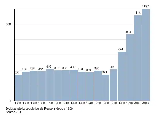Le graphique suivant résume l'évolution de la population de Rossens entre 1850 et 2008[3] :