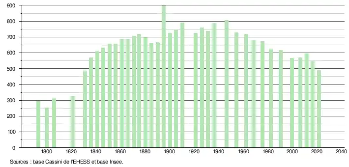 L'évolution du nombre d'habitants est connue à travers les recensements de la population effectués dans la commune depuis 1793. Pour les communes de moins de 10 000 habitants, une enquête de recensement portant sur toute la population est réalisée tous les cinq ans, les populations légales des années intermédiaires étant quant à elles estimées par interpolation ou extrapolation[29]. Pour la commune, le premier recensement exhaustif entrant dans le cadre du nouveau dispositif a été réalisé en 2006[30].
