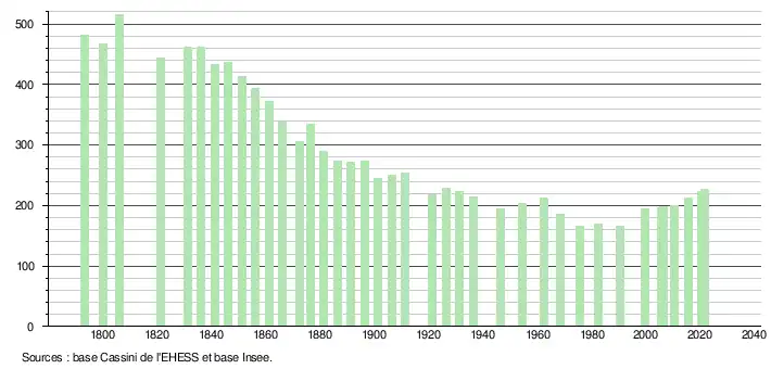 L'évolution du nombre d'habitants est connue à travers les recensements de la population effectués dans la commune depuis 1793. Pour les communes de moins de 10 000 habitants, une enquête de recensement portant sur toute la population est réalisée tous les cinq ans, les populations légales des années intermédiaires étant quant à elles estimées par interpolation ou extrapolation[31]. Pour la commune, le premier recensement exhaustif entrant dans le cadre du nouveau dispositif a été réalisé en 2005[32].