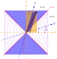En relativité restreinte, l'intervalle d'espace-temps entre deux événements quelconques est invariant par changement de référentiel inertiel. Donc, pour se ramener à deux dimensions, les changements de coordonnées , dus à un changement de référentiel, doivent laisser invariantes les quantités (Δct)2 – (Δx)2. Ainsi, en deux dimensions, les transformations de Lorentz sont des rotations hyperboliques pour des hyperboles dont l'axe focal est l'axe du temps ct. Par ces transformations, les hyperboles et leurs asymptotes (qui forment le bord du cône de lumière) restent globalement invariantes, les axes de coordonnées du référentiel changent de directions (et de longueur unité) : on peut parler d'une rotation de ces axes dans l'espace-temps de Minkowski, avec dilatation du temps et contraction des longueurs, ainsi que concevoir les diagrammes de Minkowski.