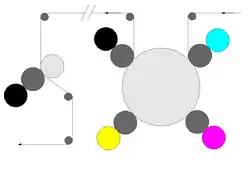 - Les barres de retournement parallèles servent à conduire la moitié de la bande de papier au-dessus ou en dessous de l'autre moitié. La semi-bande déplacée n'est pas retournée, mais transportée parallèlement par rapport au sens de marche initial (le même côté est au-dessus, comme auparavant).