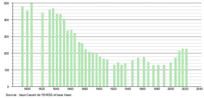 L'évolution du nombre d'habitants est connue à travers les recensements de la population effectués dans la commune depuis 1793. Pour les communes de moins de 10 000 habitants, une enquête de recensement portant sur toute la population est réalisée tous les cinq ans, les populations légales des années intermédiaires étant quant à elles estimées par interpolation ou extrapolation[23]. Pour la commune, le premier recensement exhaustif entrant dans le cadre du nouveau dispositif a été réalisé en 2006[24].