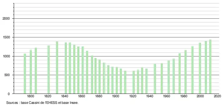 - Dans le tableau des recensements et le graphique, par convention dans Wikipédia, le principe a été retenu, pour les populations légales postérieures à 1999 de n’afficher dans le tableau des recensements et le graphique que les populations correspondant à l'année 2006, première population légale publiée calculée conformément aux concepts définis dans le décret no 2003-485 du 5 juin 2003, et les années correspondant à une enquête exhaustive de recensement pour les communes de moins de 10 000 habitants, ainsi que la dernière population légale publiée par l’Insee.