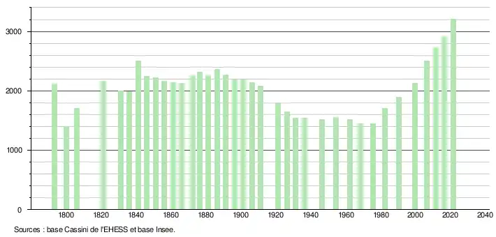 L'évolution du nombre d'habitants est connue à travers les recensements de la population effectués dans la commune depuis 1793. Pour les communes de moins de 10 000 habitants, une enquête de recensement portant sur toute la population est réalisée tous les cinq ans, les populations légales des années intermédiaires étant quant à elles estimées par interpolation ou extrapolation[27]. Pour la commune, le premier recensement exhaustif entrant dans le cadre du nouveau dispositif a été réalisé en 2006[28].