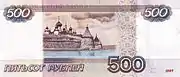 5 | 137 × 61 mm | Le Millénaire de la Russie et en fond, la cathédrale Sainte-Sophie de Novgorod | Mur du kremlin de Novgorod | "5", Cathédrale Sainte-Sophie de Novgorod | 1997 | Billet valable mais plus imprimé depuis 2001. Très rare en circulation. | ||
