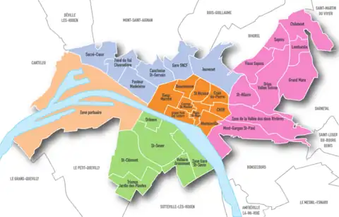 Rouen et ses douze communes limitrophes sont constitutives de la Métropole Rouen Normandie ; parmi elles, les six situées au nord sont Mont-Saint-Aignan, Déville-lès-Rouen, Bois-Guillaume, Bihorel, Saint-Martin-du-Vivier et Darnétal ; une autre, Canteleu, se trouve à l'ouest tandis que Saint-Léger-du-Bourg-Denis se trouve à l'est ; enfin, les quatre dernières communes — Le Grand-Quevilly, Le Petit-Quevilly, Sotteville-lès-Rouen et Bonsecours — se trouvent au sud de Rouen.