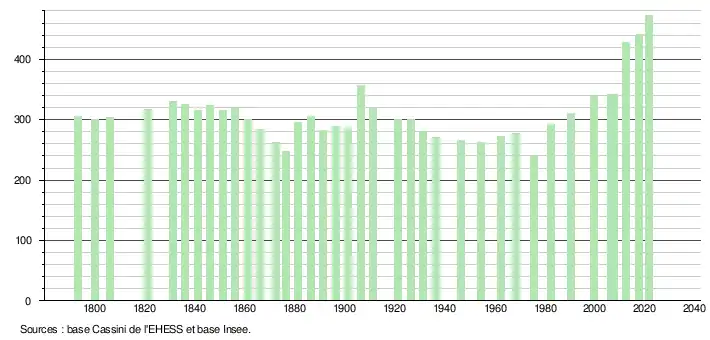 L'évolution du nombre d'habitants est connue à travers les recensements de la population effectués dans la commune depuis 1793. Pour les communes de moins de 10 000 habitants, une enquête de recensement portant sur toute la population est réalisée tous les cinq ans, les populations légales des années intermédiaires étant quant à elles estimées par interpolation ou extrapolation[30]. Pour la commune, le premier recensement exhaustif entrant dans le cadre du nouveau dispositif a été réalisé en 2007[31].
