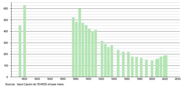 L'évolution du nombre d'habitants est connue à travers les recensements de la population effectués dans la commune depuis 1793. Pour les communes de moins de 10 000 habitants, une enquête de recensement portant sur toute la population est réalisée tous les cinq ans, les populations légales des années intermédiaires étant quant à elles estimées par interpolation ou extrapolation[27]. Pour la commune, le premier recensement exhaustif entrant dans le cadre du nouveau dispositif a été réalisé en 2008[28].