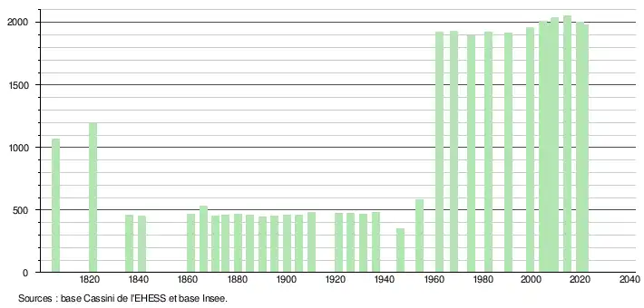 L'évolution du nombre d'habitants est connue à travers les recensements de la population effectués dans la commune depuis 1806. Pour les communes de moins de 10 000 habitants, une enquête de recensement portant sur toute la population est réalisée tous les cinq ans, les populations légales des années intermédiaires étant quant à elles estimées par interpolation ou extrapolation[22]. Pour la commune, le premier recensement exhaustif entrant dans le cadre du nouveau dispositif a été réalisé en 2004[23].