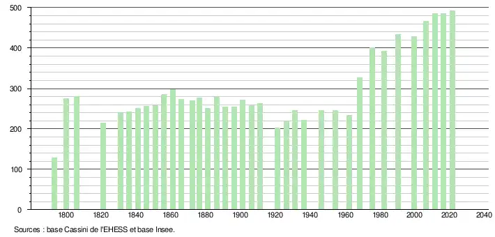 - Population municipale légale en vigueur au 1er janvier 2024, millésimée 2021, définie dans les limites territoriales en vigueur au 1er janvier 2023, date de référence statistique : 1er janvier 2021.