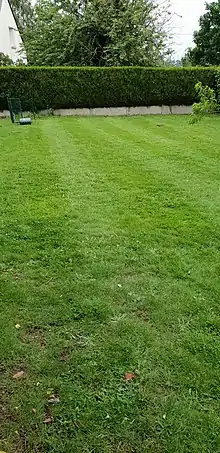 Le roulage du gazon peut être effectué simultanément à la tonte pour un gain de temps. C'est le cas des tondeuses hélicoïdales à rouleau arrière, que l'on retrouve pour les gazons traités sur un mode anglais[8]. Le rouleau est à l'origine des bandes vertes esthétiques, typiques des parcs, greens et des terrains de sport. Le rouleau incline les brins d'herbe et le sens de passage de la tondeuse entraine les nuances de vert et de brillance.