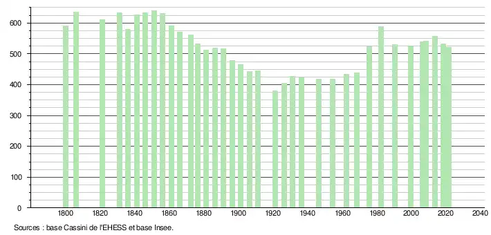 L'évolution du nombre d'habitants est connue à travers les recensements de la population effectués dans la commune depuis 1800. Pour les communes de moins de 10 000 habitants, une enquête de recensement portant sur toute la population est réalisée tous les cinq ans, les populations légales des années intermédiaires étant quant à elles estimées par interpolation ou extrapolation[27]. Pour la commune, le premier recensement exhaustif entrant dans le cadre du nouveau dispositif a été réalisé en 2008[28].