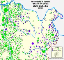 Dans l'ex-Yougoslavie, les 40 000 « Vlaši » vivant en Serbie méridionale et le long de la frontière bulgare (en roumain « Aromânii » : Aroumains), ainsi que les 34 000 « Roumains » de Voïvodine (en roumain « Românii bănăţeni din Serbia »), étaient reconnus et comptés comme minorités nationales (séparément), et figuraient sur les cartes linguistiques, tandis que les 140 000 roumanophones de la Krajina orientale (aux Portes de Fer et autour de Negotin et de Zaječar (en roumain « Românii Timoceni »)[5] n'étaient pas reconnus comme minorité, ne figuraient pas sur les cartes ethnographiques yougoslaves ni dans les statistiques, et n'étaient évoqués que comme « Serbes de langue valaque ».