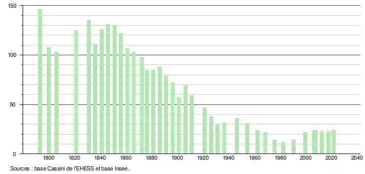 L'évolution du nombre d'habitants est connue à travers les recensements de la population effectués dans la commune depuis 1793. Pour les communes de moins de 10 000 habitants, une enquête de recensement portant sur toute la population est réalisée tous les cinq ans, les populations légales des années intermédiaires étant quant à elles estimées par interpolation ou extrapolation[16]. Pour la commune, le premier recensement exhaustif entrant dans le cadre du nouveau dispositif a été réalisé en 2007[17].