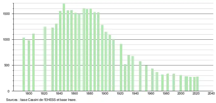 L'évolution du nombre d'habitants est connue à travers les recensements de la population effectués dans la commune depuis 1793. Pour les communes de moins de 10 000 habitants, une enquête de recensement portant sur toute la population est réalisée tous les cinq ans, les populations légales des années intermédiaires étant quant à elles estimées par interpolation ou extrapolation[33]. Pour la commune, le premier recensement exhaustif entrant dans le cadre du nouveau dispositif a été réalisé en 2007[34].