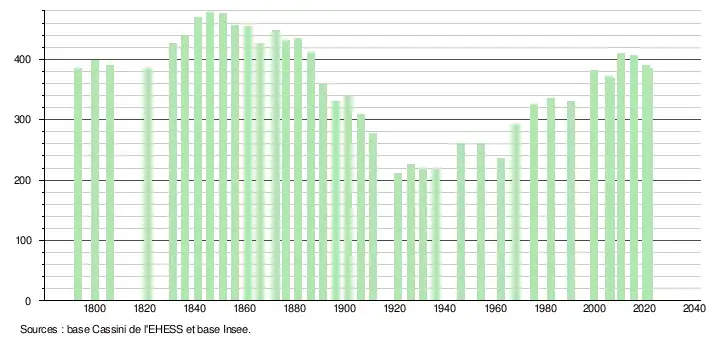 L'évolution du nombre d'habitants est connue à travers les recensements de la population effectués dans la commune depuis 1793. Pour les communes de moins de 10 000 habitants, une enquête de recensement portant sur toute la population est réalisée tous les cinq ans, les populations légales des années intermédiaires étant quant à elles estimées par interpolation ou extrapolation[17]. Pour la commune, le premier recensement exhaustif entrant dans le cadre du nouveau dispositif a été réalisé en 2005[18].