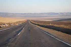 La route en Bouriatie avec Tarbagataï en fond. | |