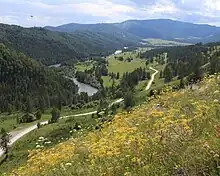 La route longeant la Koksa près de Vassilievo (vers le fond). - 207,4 km — Col de Gromotoukha (1071 m[4])