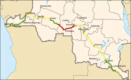 | Villes principales | Lubumbashi Likasi Kamina Mbujimayi Kananga Tshikapa Kikwit Kenge Kinshasa Mbanza-Ngungu Matadi Boma |