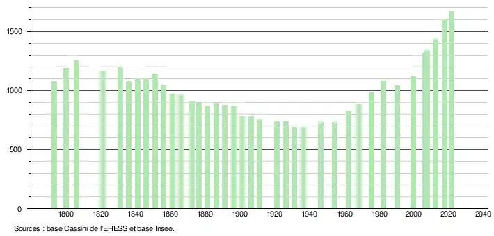 L'évolution du nombre d'habitants est connue à travers les recensements de la population effectués dans la commune depuis 1793. Pour les communes de moins de 10 000 habitants, une enquête de recensement portant sur toute la population est réalisée tous les cinq ans, les populations légales des années intermédiaires étant quant à elles estimées par interpolation ou extrapolation[22]. Pour la commune, le premier recensement exhaustif entrant dans le cadre du nouveau dispositif a été réalisé en 2007[23].