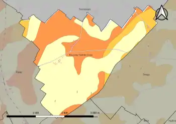 Par ailleurs le sol du territoire communal peut faire l'objet de mouvements de terrain liés à la sècheresse. Le phénomène de retrait-gonflement des argiles est la conséquence d'un changement d'humidité des sols argileux. Les argiles sont capables de fixer l'eau disponible mais aussi de la perdre en se rétractant en cas de sècheresse[46]. Ce phénomène peut provoquer des dégâts très importants sur les constructions (fissures, déformations des ouvertures) pouvant rendre inhabitables certains locaux. Celui-ci a particulièrement affecté le Loiret après la canicule de l'été 2003. Une grande partie nord du territoire communal, dont le bourg, est exposée à un aléa « moyen » face à ce risque, selon l'échelle définie par le Bureau de recherches géologiques et minières (BRGM)[47].
