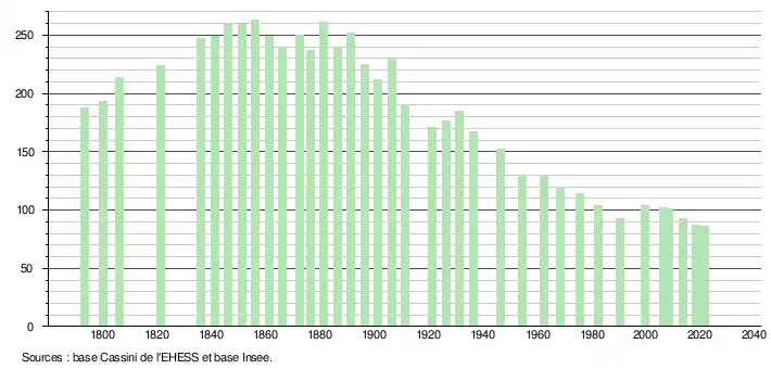 L'évolution du nombre d'habitants est connue à travers les recensements de la population effectués dans la commune depuis 1793. Pour les communes de moins de 10 000 habitants, une enquête de recensement portant sur toute la population est réalisée tous les cinq ans, les populations légales des années intermédiaires étant quant à elles estimées par interpolation ou extrapolation[14]. Pour la commune, le premier recensement exhaustif entrant dans le cadre du nouveau dispositif a été réalisé en 2008[15].