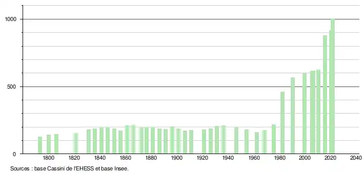 L'évolution du nombre d'habitants est connue à travers les recensements de la population effectués dans la commune depuis 1793. Pour les communes de moins de 10 000 habitants, une enquête de recensement portant sur toute la population est réalisée tous les cinq ans, les populations légales des années intermédiaires étant quant à elles estimées par interpolation ou extrapolation[43]. Pour la commune, le premier recensement exhaustif entrant dans le cadre du nouveau dispositif a été réalisé en 2005[44].