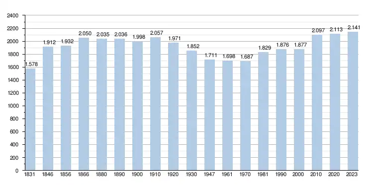Les chiffres des années 1831 à 1970 tiennent compte des chiffres des anciennes communes fusionnées.