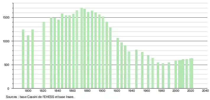 L'évolution du nombre d'habitants est connue à travers les recensements de la population effectués dans la commune depuis 1793. Pour les communes de moins de 10 000 habitants, une enquête de recensement portant sur toute la population est réalisée tous les cinq ans, les populations légales des années intermédiaires étant quant à elles estimées par interpolation ou extrapolation[21]. Pour la commune, le premier recensement exhaustif entrant dans le cadre du nouveau dispositif a été réalisé en 2004[22].