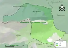 - les « montagnes et vallées du Donezan centre et ouest » (8 618 ha), couvrant 12 communes dont 7 dans l'Ariège, 3 dans l'Aude et 2 dans les Pyrénées-Orientales[32],