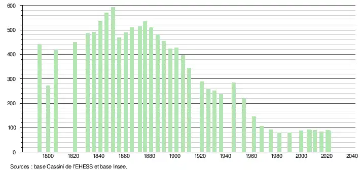 - Population municipale légale en vigueur au 1er janvier 2024, millésimée 2021, définie dans les limites territoriales en vigueur au 1er janvier 2023, date de référence statistique : 1er janvier 2021.