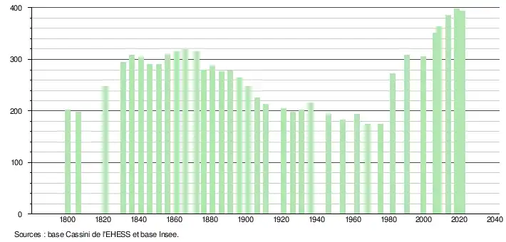 L'évolution du nombre d'habitants est connue à travers les recensements de la population effectués dans la commune depuis 1800. Pour les communes de moins de 10 000 habitants, une enquête de recensement portant sur toute la population est réalisée tous les cinq ans, les populations légales des années intermédiaires étant quant à elles estimées par interpolation ou extrapolation[17]. Pour la commune, le premier recensement exhaustif entrant dans le cadre du nouveau dispositif a été réalisé en 2008[18].