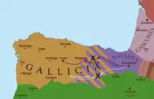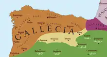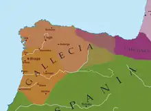 Avec l'arrivée des Suèves d'Europe centrale entre 409 et 411[5], la Galice cesse d'être la province romaine Gallaecia[6], pour devenir finalement un royaume dont la cour est installée à Braga, un royaume que les Suèves tentent rapidement d'agrandir vers le sud aux dépens de l'Empire romain, en incorporant à leur domaine, et de façon permanente, une bonne partie de la province romaine de Lusitanie, et en parvenant même à y inclure temporairement sa capitale Emerita Augusta (devenue Mérida)[7] en 439, et même la ville de Séville en 441, villes qui sont finalement abandonnées à la suite de la réaction des Wisigoths, dont l'épisode le plus important est la bataille de la rivière Órbigo.